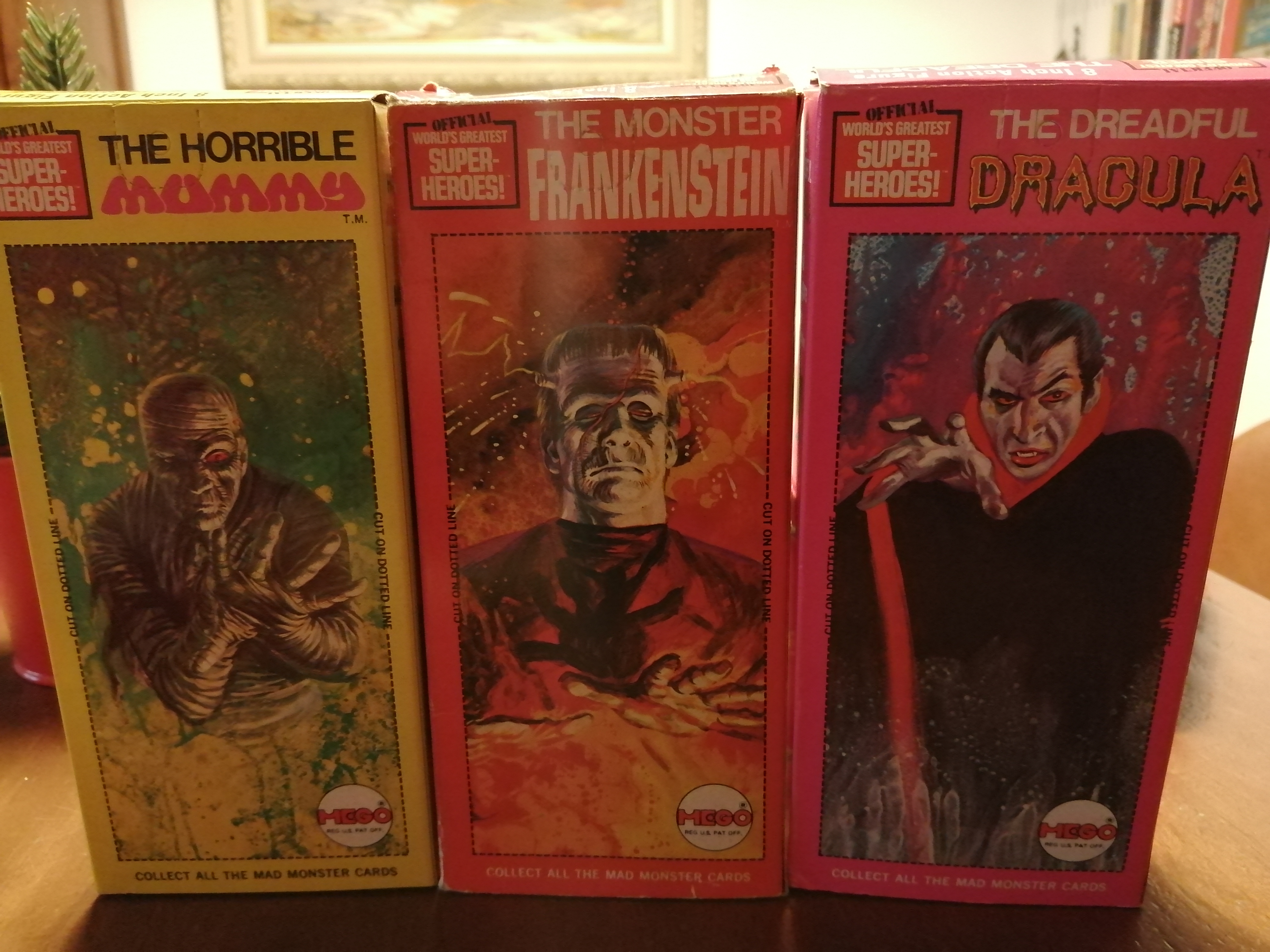 ...a estas alturas he podido por fin recopilar tres de los monstruos maravillosos de MEGO, originales y con sus cajas sólidas(la version más chula para mi) que complementan una colección de figuras que me parece maravillosa,falta WOLFMAN.....al tiempo, como curiosidad comentar que los Mad Monsters se lanzaron por primera vez así, en cajas sólidas en 1973 con impresionantes ilustraciones de cada monstruo en el frente. En la parte posterior, hay una tarjeta que se supone que hay que recortar y que tiene el mismo diseño del frente del paquete pero sin la mayor parte del texto, el ilustrador Gray Morrow hizo el diseño de las cajas..sin par